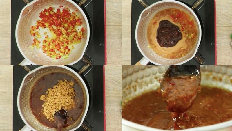 Bạn bắc chảo lên bếp, thêm 1 muỗng canh dầu ăn, 10g gừng, 15g hành paro, 5g ớt sừng vào rồi đảo đều. Kế đến, bạn cho 60g bơ đậu phộng, 60g tương đen, 2 muỗng canh mật ong, 2 muỗng canh hạt nêm chay vào rồi tiếp tục khuấy đều.
