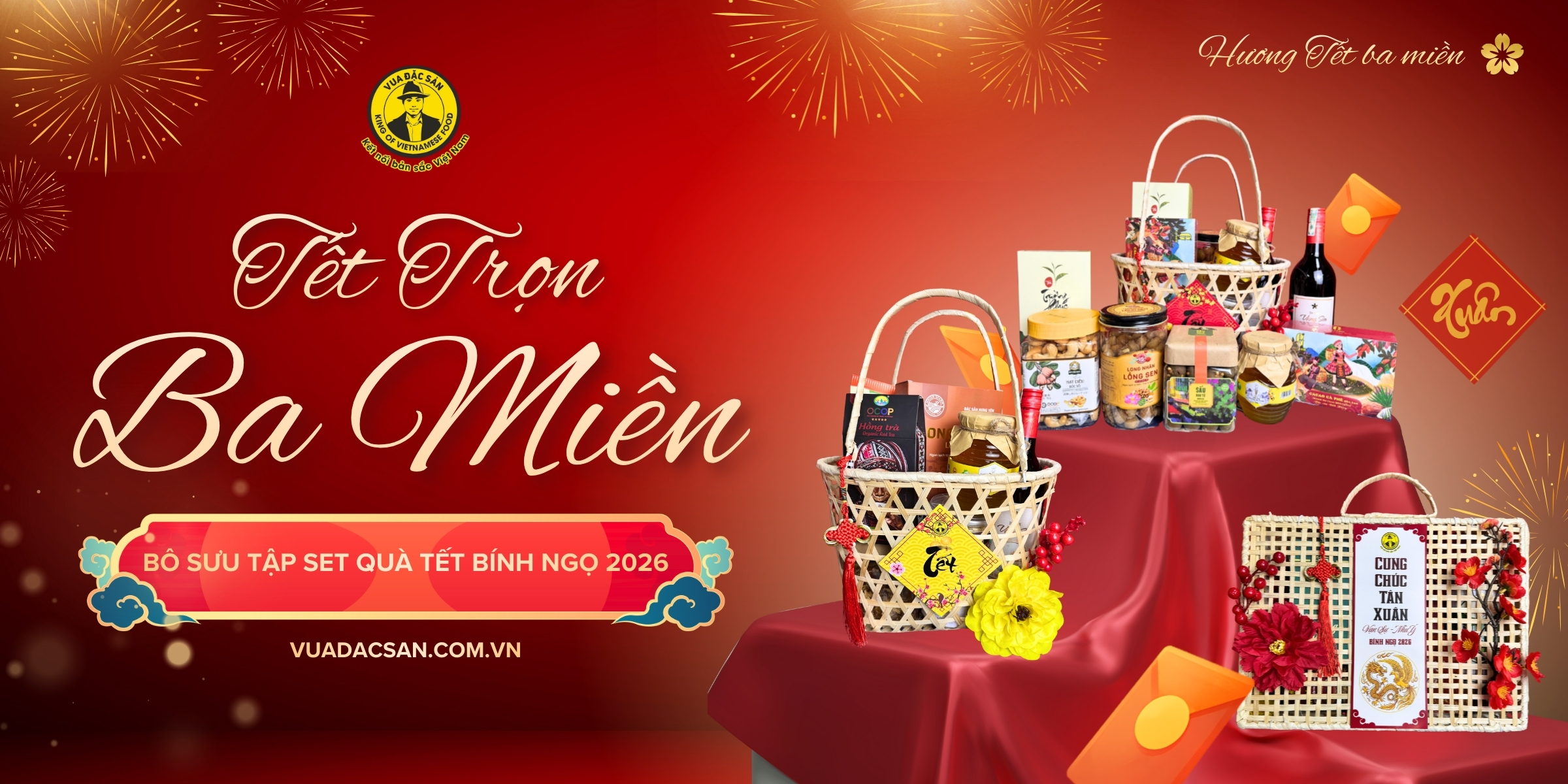 Vua Đặc Sản mang đến những giỏ quà Tết gói trọn hương vị Tết 3 miền (Bắc - Trung - Nam). Từng sản phẩm là sự kết tinh ẩm thực vùng miền, tái hiện giá trị truyền thống thiêng liêng, để mỗi độ Xuân về, hồn quê hương lại sáng bừng trong từng món quà.