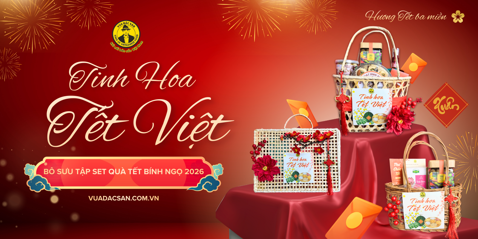 Set quà Tết 2026 Tinh Hoa Tết Việt 05 là sản phẩm nổi bật trong Bộ sưu tập Hương Tết Ba Miền 2026 của Vua Đặc Sản, kết tinh tinh hoa ẩm thực Bắc – Trung – Nam, mang đến món quà Tết sang trọng, ý nghĩa và giàu giá trị văn hóa Việt.